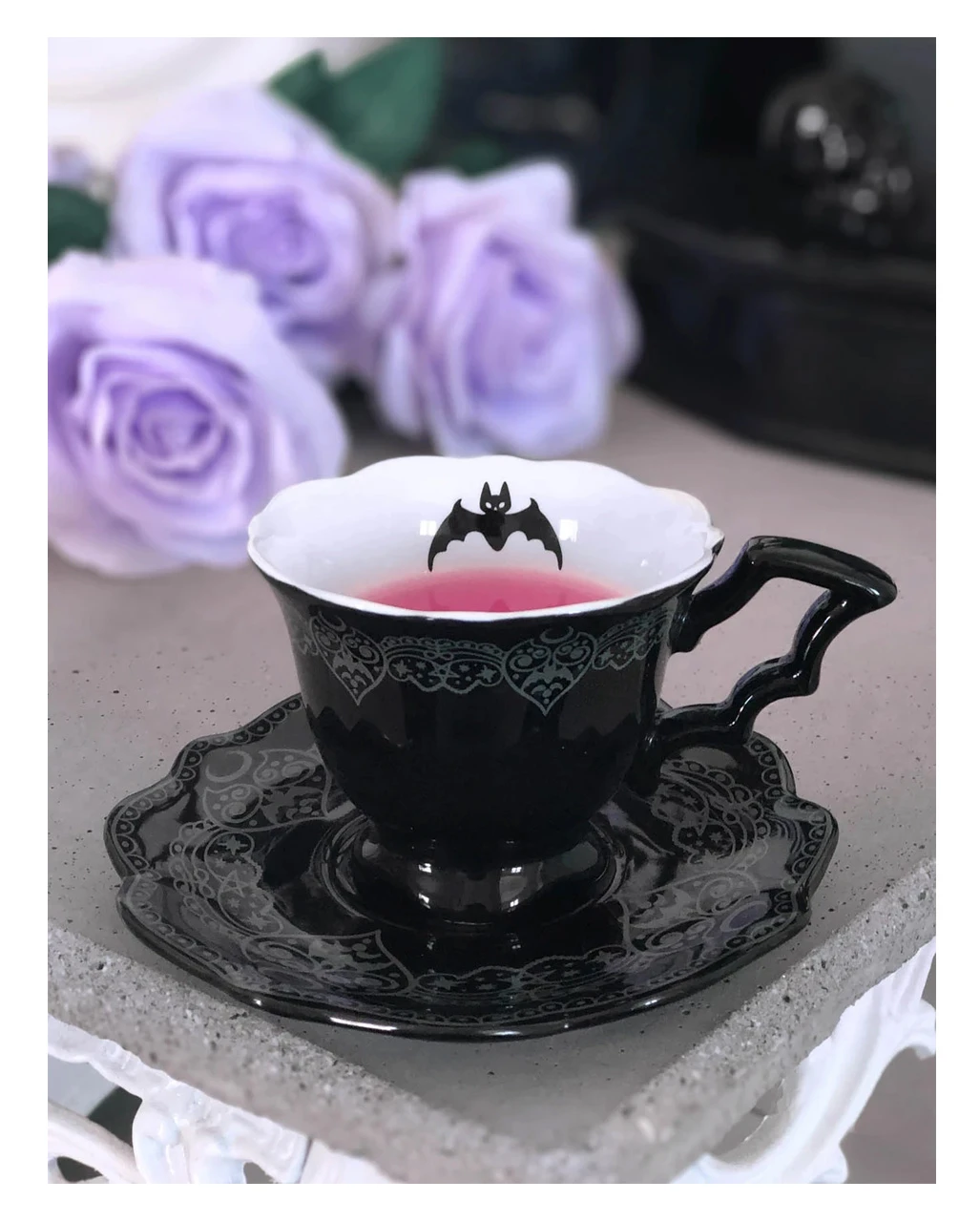 Mit unserer After Midnight Tasse & Unterteller KILLSTAR hast du das ideale Geschirr für dein nächstes Gothic Teekränzchen. Blutmondtee und Kräuterkaffee wollen schließlich stilvoll getrunken werden. Die exquisite Gothic Tee- oder Kaffetasse mit Fledermaus Aufdruck würde sogar Morticia Adams gefallen. Das edle Gothic Geschirr sieht nämlich aus, als käme es aus dem Bestand adeliger Vampire aus dem viktorianischen Zeitalter. Schließlich wurde dort gerne aus derart liebevoll verzierten Tassen getrunken.