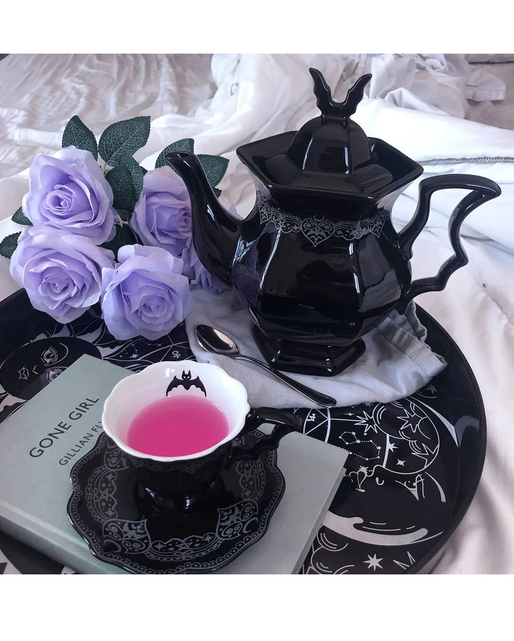 Die Liebe zum Detail zeigt sich besonders schön an unserer KILLSTAR After Midnight Tasse & Unterteller. Die Gothic Kaffeetasse ist außen schwarz und besitzt einen Henkel, der wie ein Fledermaus Flügel geformt ist. Als weiteres vampirisches Detail wurde im weißen Innenteil der Keramik Tasse eine Fledermaus aufgedruckt. Passend zu der Tasse im viktorianischen Stil findet ihr hier auch noch die Teekanne und das KILLSTAR Serviertablett Sky Spirit.