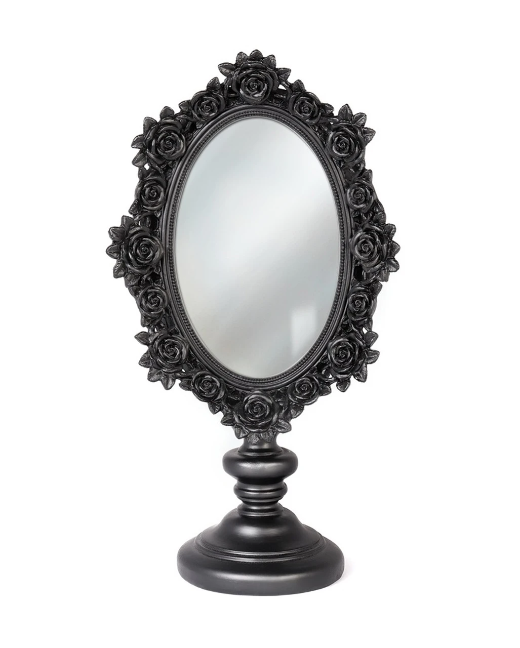 Der Black Rose Schminktisch Spiegel besteht aus Kunststein und Glas. Er ist ca. 28 x 15 x 9 cm groß. Als romantisches Boudoir Zubehör macht sich der Gothic Spiegel ideal im Badezimmer oder Schlafzimmer. Platziere ihn gemeinsam mit unserer Daemon Sarg Schmuck Schatulle KILLSTAR und der Sarg Vitrine aus Glas KILLSTAR.