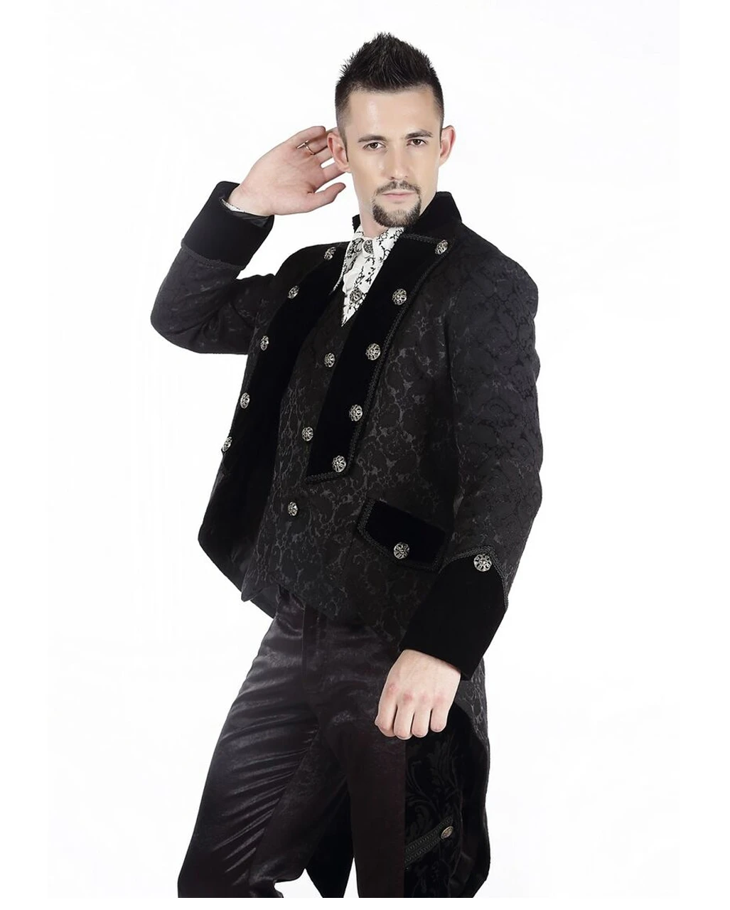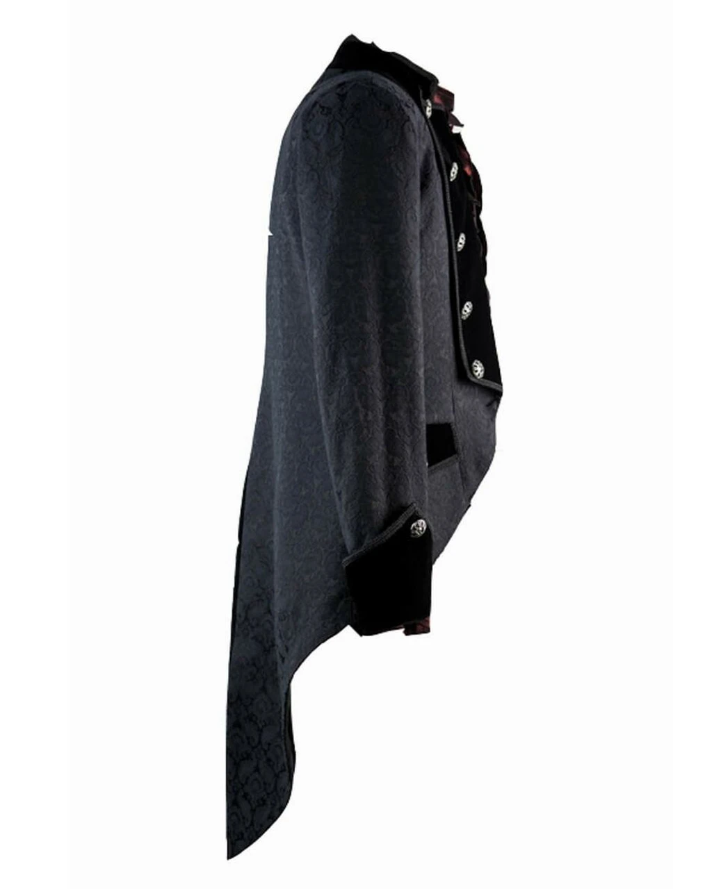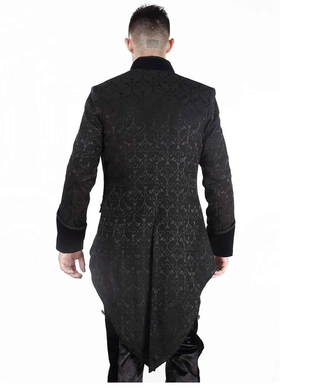 Der schwarze Brokat Herren Gehrock ist aus einem Stoff gefertigt, der einem viktorianischen Brokatmuster nachempfunden ist. Er hat einen kleinen Stehkragen, umgeschlagene samtene Armaufschläge, die mit je einem silbernen Knopf verziert sind, und vorne und auf den Ärmeln feine schwarze Borten.Vorne sind zwei Taschen mit samtenen Deckeln angebracht. Der Mantel hat vorne ein umgeschlagenes Revers ais Samt, auf dem silberne Zierknöpfe sowie schwarze Borten festgenäht sind. Verschlossen wird der Mantel mit kleinen Häckchen. Besonders auffällig ist der Mantel durch den Schwalbenschwanz auf der Rückseite, der zusätzlich noch einen Gehschlitz aufweist. Um dein dunkles Outfit abzurunden empfehlen wir dir das Gothic Rüschenhemd weiß und die Brokat Männer Weste schwarz.