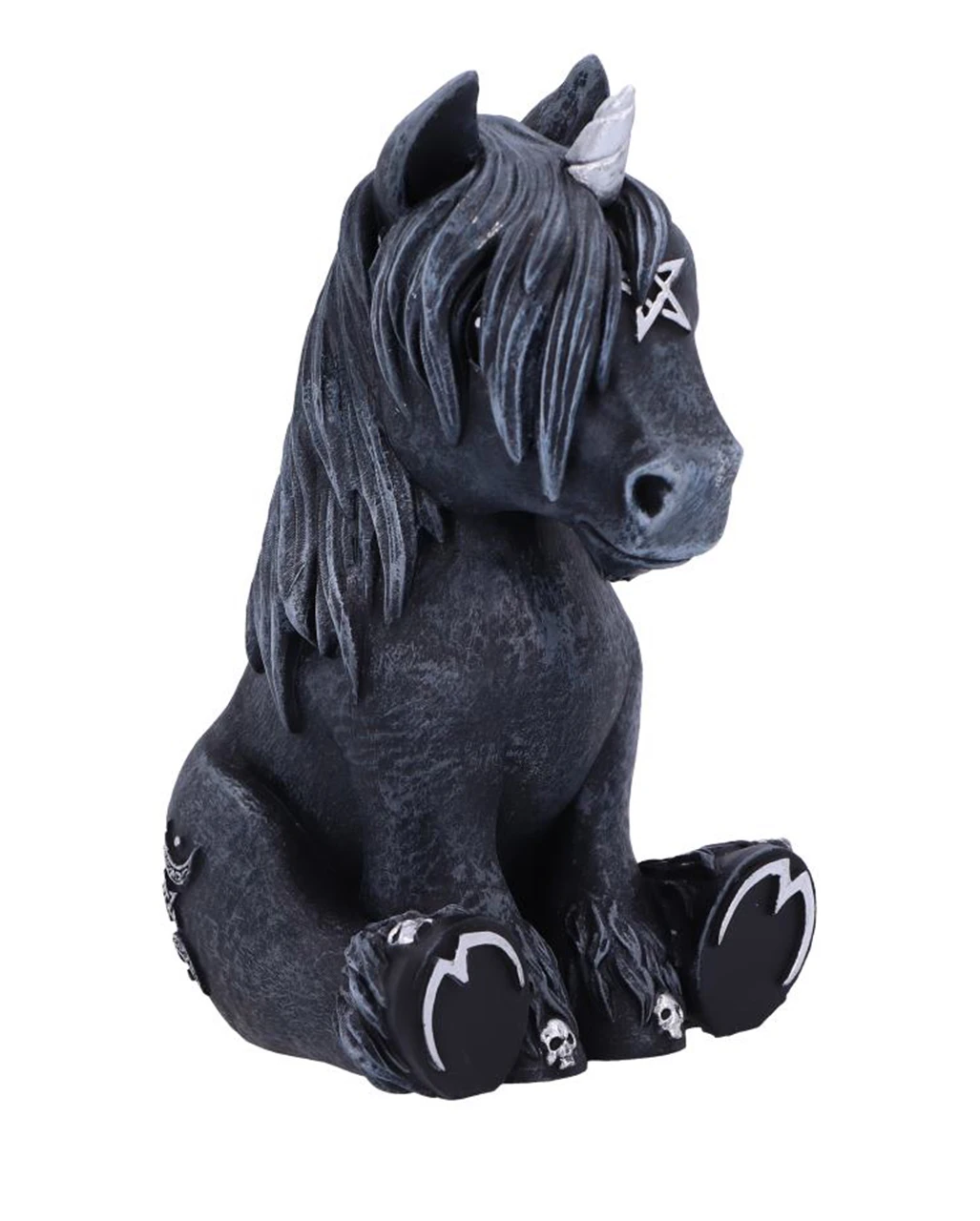Die Culticorn Cult Cutie Figur besteht aus feinstem Kunststein und ist in Detailarbeit von Hand bemalt. Die schwarze Einhorn Figur ist etwa 10,2 cm groß und passt ins Regal, aufs Fensterbrett oder auf den Tisch. Sie kommt in sitzender Pose. Die Vorderbeine hat es vor sich gestellt. Auf der Stirn des Gothic Unicorns befindet sich ein Pentagramm, und die Hinterbeine sind mit kleinen Schädeln verziert. Noch mehr okkulte Wohnaccessoires wie die Himmlische Katzenfigur 26cm findest du hier bei uns!