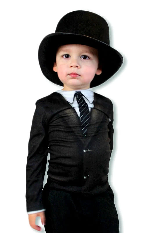 Ein teurer, echter Anzug mit weißem Hemd und Krawatte muss es ja für einen kleinen Jungen nicht wirklich sein. Da macht unser cooles Fake Tuxido mit Krawatte T-Shirt auf jeden Fall auch eine gute Figur. Mit dem schwarzem, realistisch bedruckten Anzug machst du garantiert Eindruck. Ganz gleich, ob du damit als Gentleman, Gangster oder Bräutigam verkleidet gehen wirst, dass T-Shirt mit dem realistischem Fotomotiv eines Anzugs hilft dir elegant auszusehen.