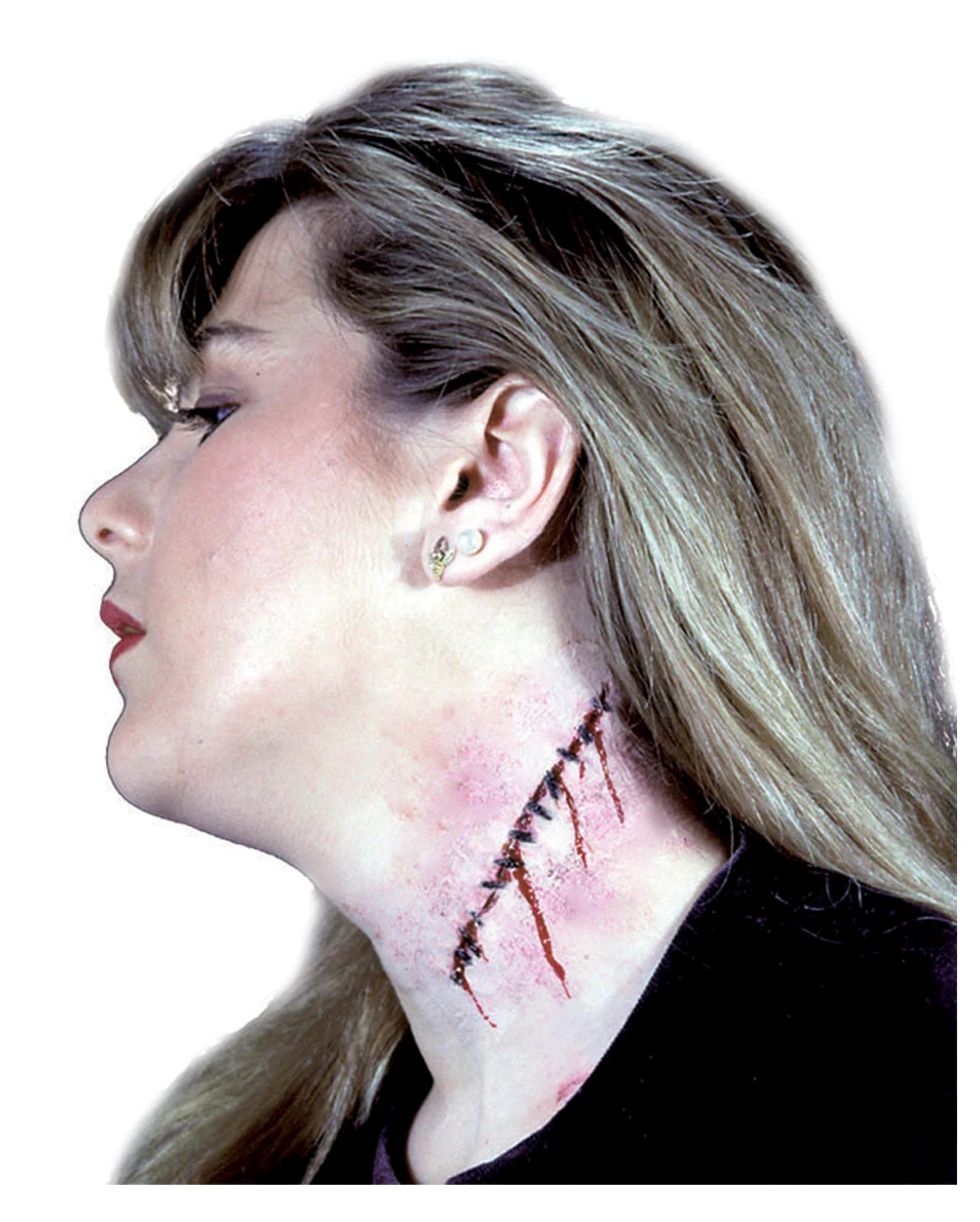 Schminke dich zu Halloween und Fasching als Unfallopfer mit frisch vernähter Wunde, die am Aufplatzen ist. Was gibt es Schlimmeres, als eine frisch genähte Wunde die wieder aufzureißen droht? Mit der Latexapplikation einer genähten Wunde, kannst du dich als Unfallopfer oder als letzter Überlebender aus einem Slasher-Film à la „Freitag der 13.“ und „Halloween“ schminken.