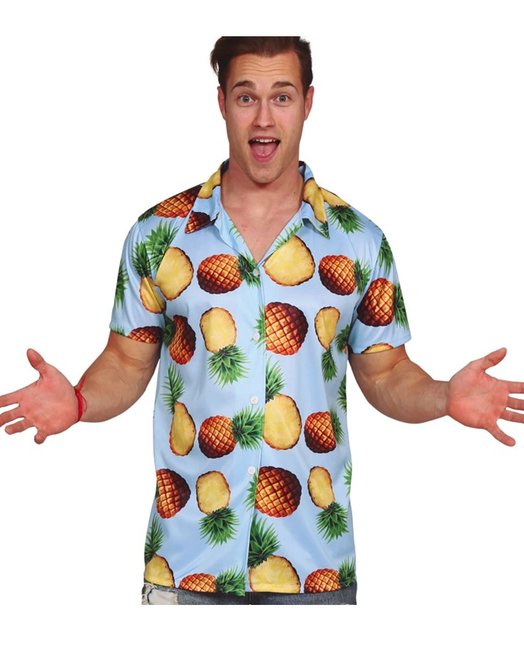 Das Hawaii Hemd mit Ananas Motiv ist in M und L Größe erhältlich und ein vielseitig einsetzbares Kostümaccessoire. Es handelt sich um ein hellblaues Hawaiihemd mit Ananas Motiven. Das weiche Material schmiegt sich deiner Haut perfekt an und bietet höchsten Tragekomfort. Hierzu passt unsere Polizei / Pilotenbrille für den coolen Look!