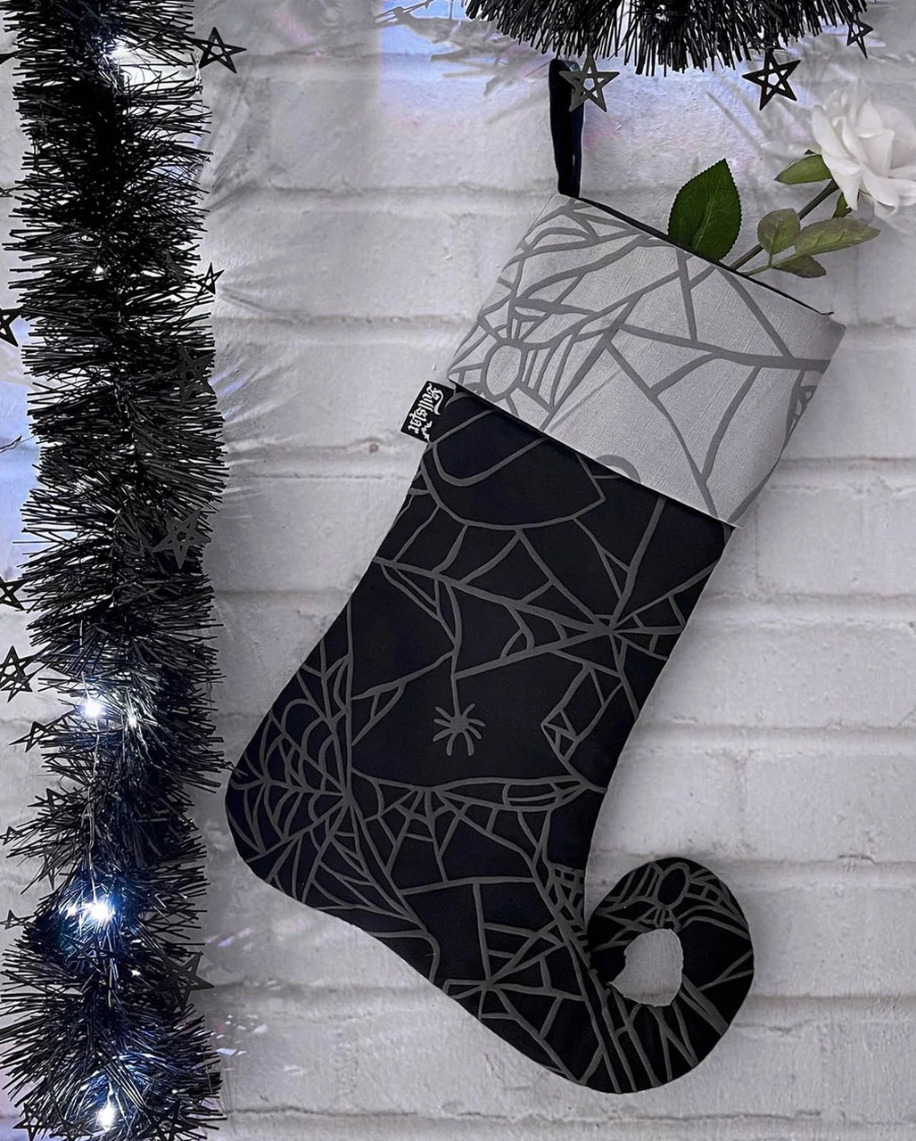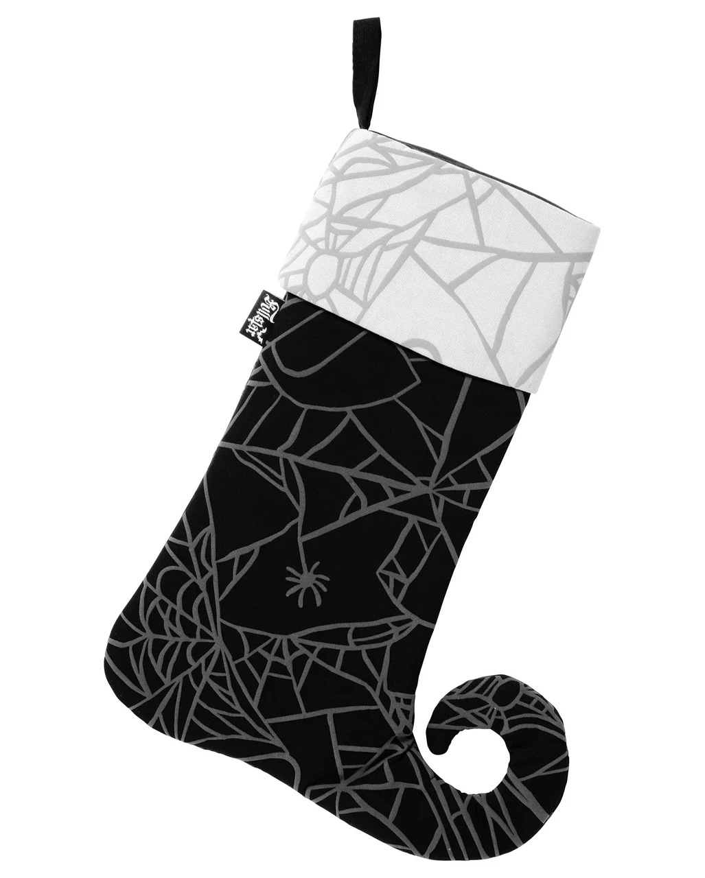 Als Gothic Wohn Accessoire für die Weihnachtszeit einfach unverzichtbar: Der Hexmas Strumpf KILLSTAR ist von der Form her ein klassischer Nikolaus Strumpf mit gebogenem Ende. Die Farbgebung aber ist düster und ideal als dekorative Gothic Homeware. Das zarte Spinnenweben Muster perfektioniert den Look dieser besonderen Gothic Christmas Deko.