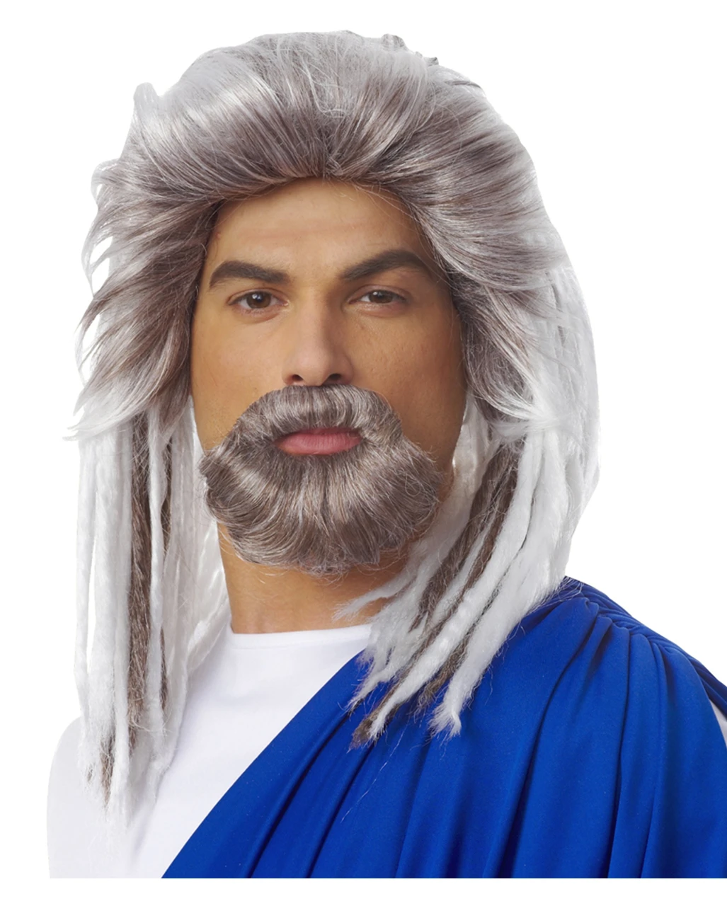 Die König der Meere Perücke mit Bart entspricht optisch bis ins Detail den bekannten Darstellungen aus zahlreichen Filmen und Bildern des Gottes der Meere. Eine stürmische, sorgsam nach hinten gekämmte grau-weiße Mähne aus Kunsthaar erzeugt den charakteristischen Look Poseidons, während der ebenfalls grau-weiße und adrett gestutzte Kostüm-Bart das ehrwürdige Aussehen einer Gottheit unterstreicht. Eingeflochtene Dreadlocks schmücken deine Faschings-Frisur zusätzlich. Dazu empfehlen wir die Römer Sandalen zum Schnüren braun und die Königs-Krone mit Schmucksteinen.