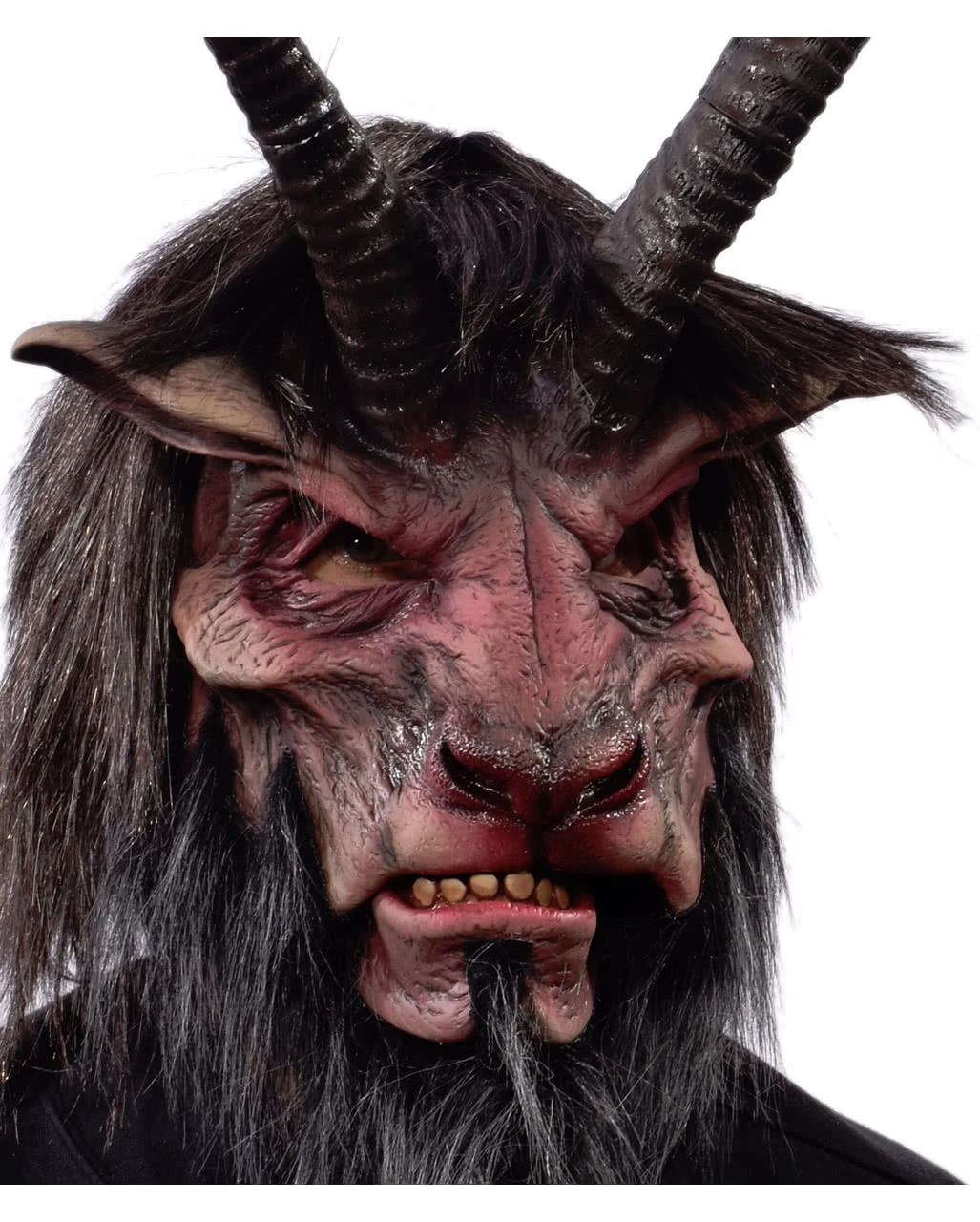 Die Krampus Maske ist mit ihrer braun melierten hochwertigen Perücke und den grau melierten Kunsthaaren an Backen & Kinn – sowie den ca. 40 cm langen imposanten Hörnern, die am Ansatz mit Kunststoff verstärkt sind – eine originalgetreue Abbildung des mystischen Fabelwesens. Tiefe Gesichtsfalten und die rosa-graubraune Hautfarbe runden den schaurigen Anblick ab. Neben dem angenehmen Tragekomfort und guter Sicht dank Aussparungen an den Augen kommt das Maul als Extrateil daher, wird über das Kinn gezogen und bewegt sich somit gruselig mit. Zwei Gummibänder über Kreuz sorgen zudem für guten Halt am Hinterkopf. Mit der Nikolaus Rute und Pranken aus Latex haben wir auch das passende Zubehör bei karneval-universe.de im Sortiment.