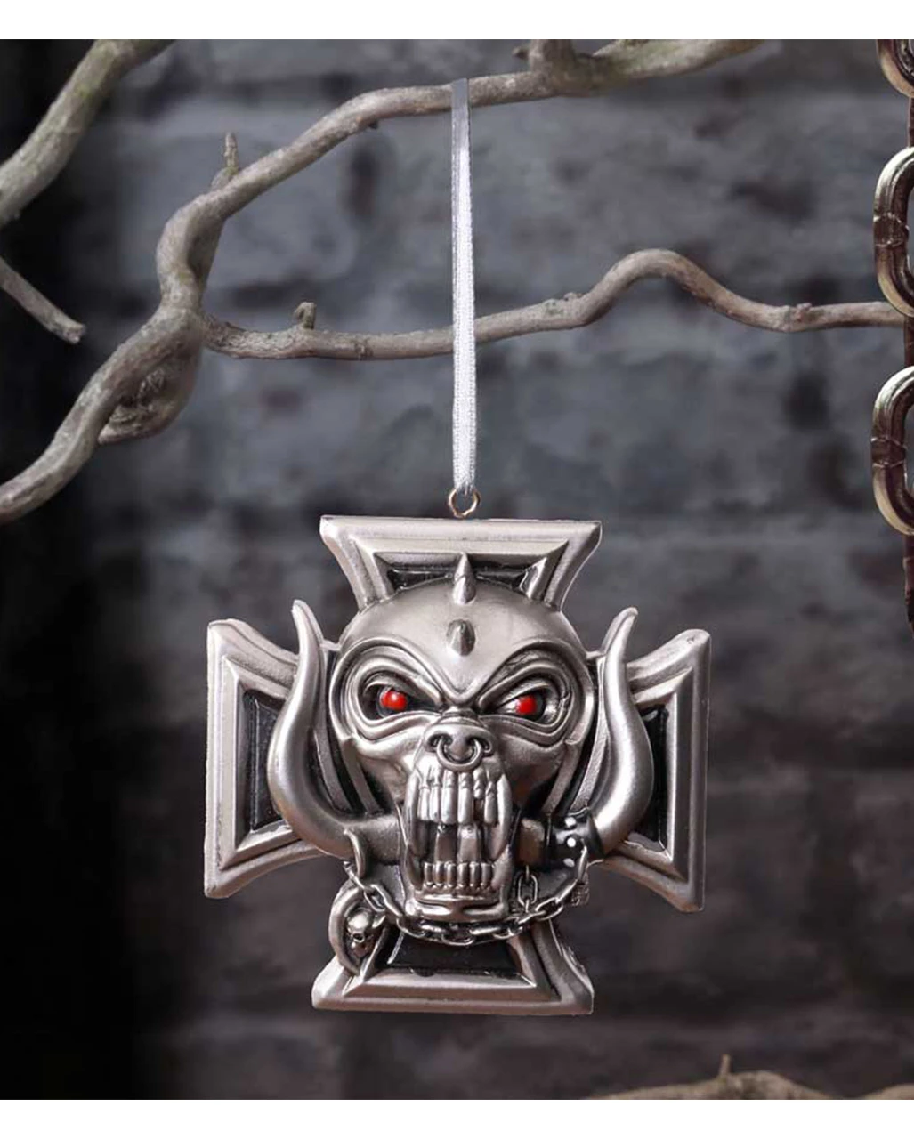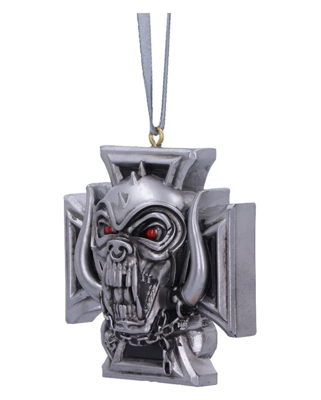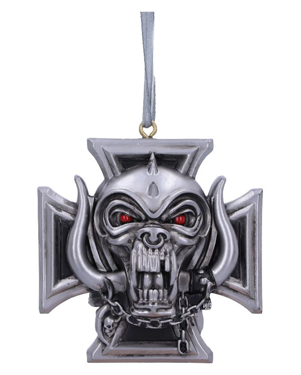 Der Motorhead Warpig Kreuz Anhänger ist der ideale Christbaumschmuck, wenn ihr euren Weihnachtsbaum rockiger gestalten wollt. Der Anhänger zeigt das ikonische speichelleckende Warpig (auch bekannt als „Snaggletooth“). Das Zeichen steht für Potenz, Lautstärke und Freiheit. In Form des kultigen Motorhead Iron Cross Warpig bekommt es eine ganz besondere Note. Die tiefroten Augen werden sicher auffallen am Weihnachtsbaum. Mit der kleinen Schlaufe und dem Band kannst du den Motörhead Kreuz Anhänger als Heavy Metal Christbaumschmuck einfach aufhängen.