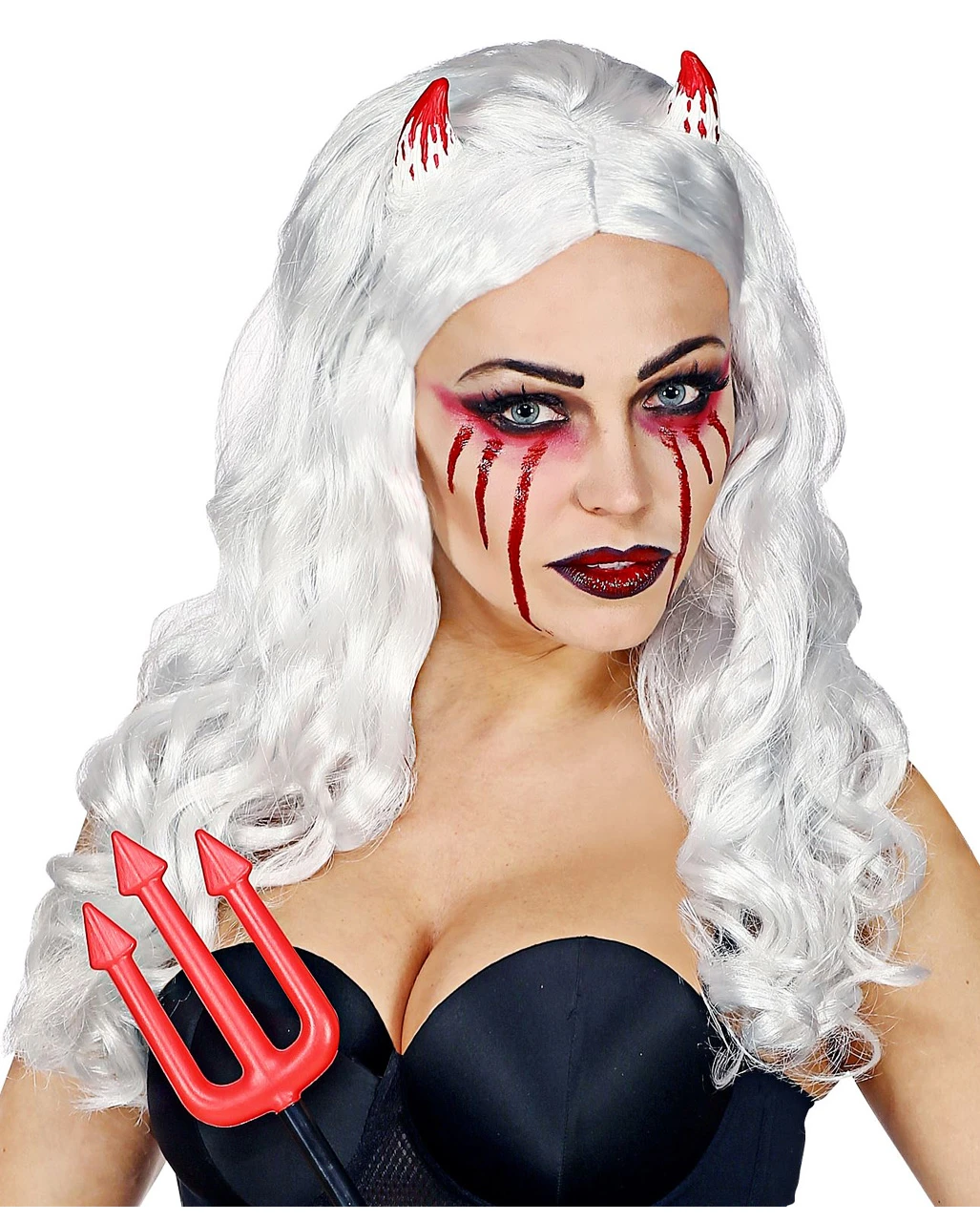 Die Satansbraut Perücke Weiß mit Hörnern besteht aus Kunsthaar. Es handelt sich um eine weiße Faschingsperücke mit kleinen blutigen Hörnern. Das Kostümaccessoire ist die perfekte Ergänzung für diverse Teufelin Kostüme und kann vielseitig kombiniert werden. Auch die Rote Teufelinperücke mit Hörner lässt dich zum höllisch-geilen Blickfang werden!