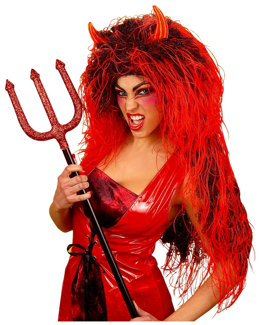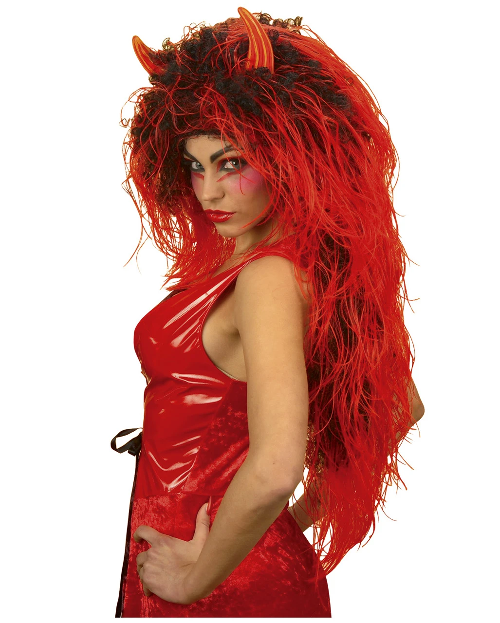 Feurig und heiß geht es in der Hölle zu und so manches Teufelsweib heizt dem Satan dabei richtig ein! Rot, glühendes und schwarz wie Kohle meliertes Haar mischt sich in der wilden Frisur, während rote Teufelshörner aus dem Wuschelkopf hervor stechen.